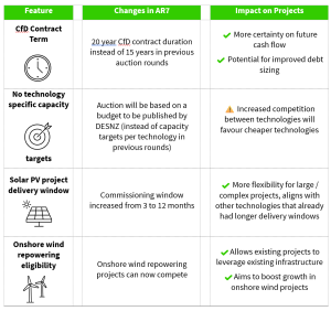 Broadly, AR7a offers more flexibility and longer term certainty for bidders but also introduces more competition between technologies. These changes aim to award CfDs to projects that offer best value for money and provide bidders with some additional certainty in their project. However, as we discuss below, there are material risks for projects which will remain.