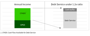 The amount of debt a project can support is calculated by forecasting the future cash flows of the project in an investment grade financial model. The model will be used to calculate the available cash flow that is forecast to be available to pay interest and capital repayments on the debt. Put simply, it is revenues less operating cost and tax. The available cash is used to backsolve the amount of debt the project can support. Debt sizing is often based on conservative forecast scenarios e.g. low energy yield forecasts and prudent macroeconomic inputs, with repayment profiles aligned to expected cash flows via debt service cover ratios (DSCR). Higher DSCRs, which are more prudent and support less debt, are attributed to more volatile, or harder to predict, “variable” revenues. For example, higher DSCRs would be applied to revenues which are subject to wholesale market price fluctuations. Lower DSCRs are applied to more predictable revenue streams, such as CfD income.